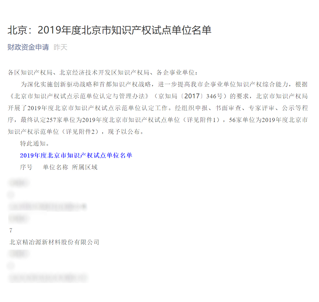2019年12月下旬,北京精冶源新材料股份有限公司(簡稱:精冶源;股票代碼:831091)歷經嚴格而規范的書面審查、專家評審、公示等多項程序,被北京市知識產權局認定為2019年度北京市知識產權試點單位。 此次認定要求企業屬于知識產權密集型產業領域,有持續創新活動,有一定數量的專利申請且近三年專利實施率不低于40%等多…